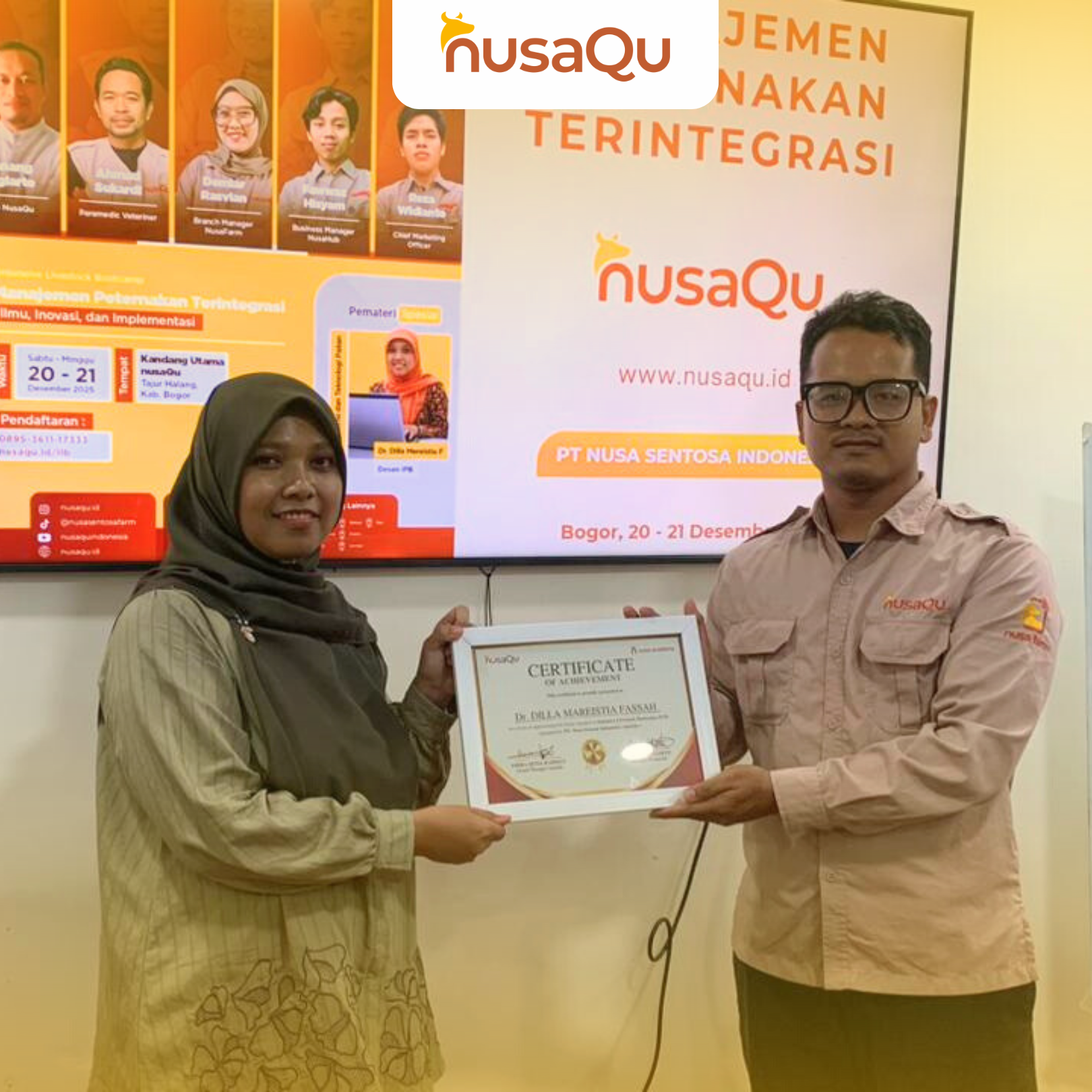 Pada tanggal 20–21 Desember 2025, PT Nusa Sentosa Indonesia (nusaQu) sukses menyelenggarakan Pelatihan Bisnis Ternak Terintegrasi Batch 3 yang diikuti oleh 9 peserta dari berbagai latar belakang. Kegiatan ini bertujuan untuk memperluas wawasan peserta mengenai penerapan sistem peternakan terintegrasi ala nusaQu, yang mengelola seluruh proses usaha peternakan secara menyeluruh, mulai dari hulu hingga hilir.