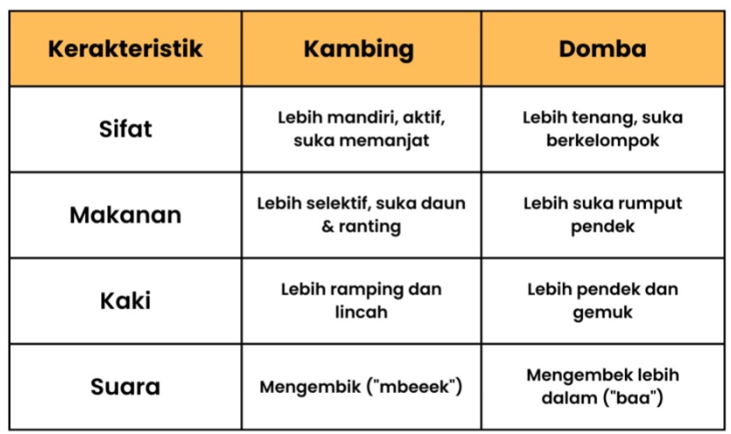 Kambing dan domba memiliki perbedaan yang jelas, mulai dari bentuk tanduk, ekor, jenis bulu, hingga perilaku. Kambing cenderung lebih aktif dengan bulu pendek, sementara domba memiliki bulu wol tebal dan ekor yang lebih panjang.